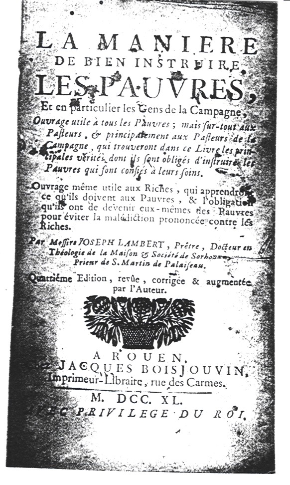 "Joseph Lambert est né à Paris en 1654. Docteur de Sorbonne, prieur de Palaiseau et curé de Saint-André des Arts, il a multiplié les actions charitables et a beaucoup écrit en faveur de l’instruction des pauvres. La Manière de bien instruire les pauvres est un des ouvrages qu’il a rédigé à ce sujet. Appelant de la bulle Unigenitus et proche de la mouvance janséniste, il s’est éteint en 1722. Il ne faut pas le confondre avec le polémiste janséniste Bernard Lambert qui vécut dans la seconde moitié du XVIIIème siècle".